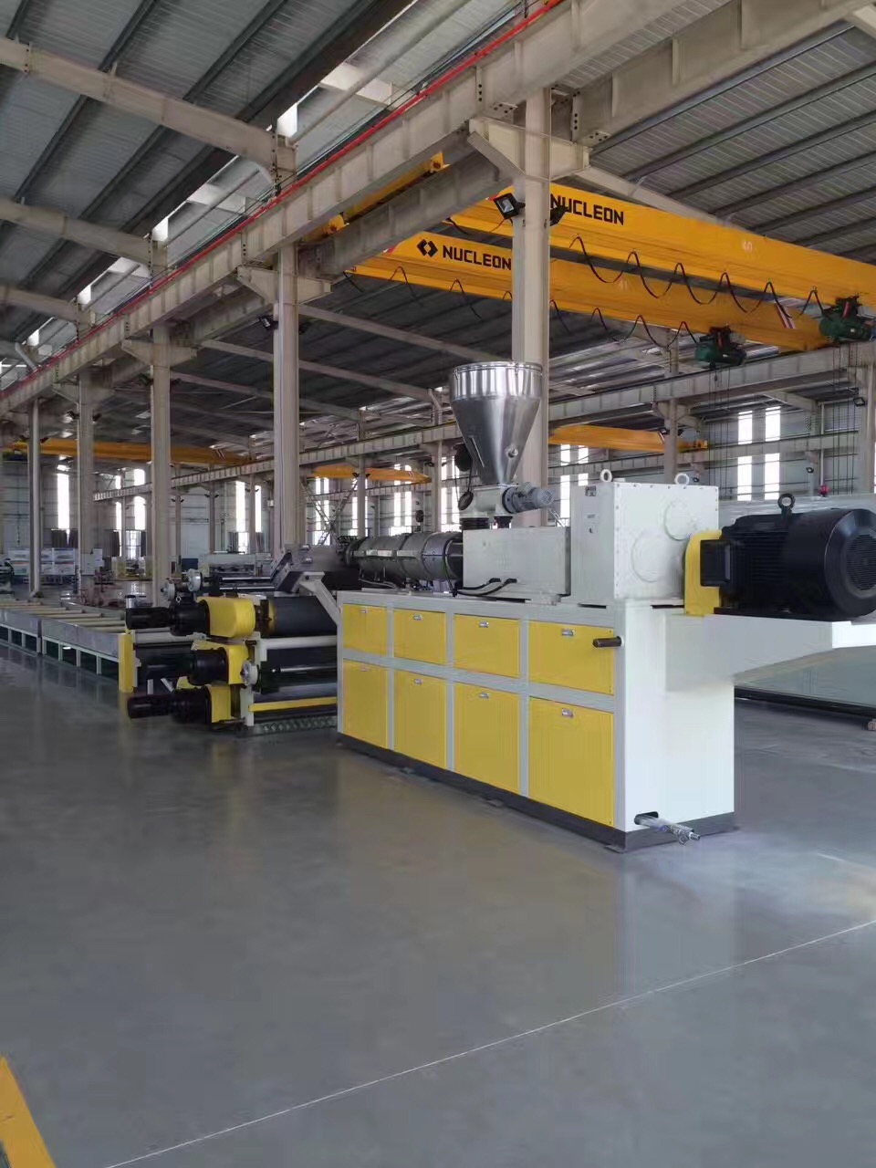 上海金緯擠出機械有限公司依靠公司強大的研發能力經過不斷創新,開發出來的全新復合結構的PVC軟質復合地板生產線試機成功,為目前火熱的SPC,WPC復合地板市場帶來了更大商機,該生產線替補了國內市場空白,完全可以取代傳統的蒸汽壓機復合工藝。