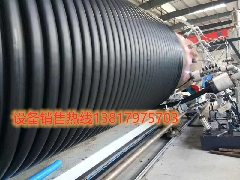 從擠塑機口模擠出的 190 ℃的平料帶和 O 型管料按預定的位置均勻地纏繞在加熱的鋼制輥筒模具上,自然冷卻后保證了管材熔接縫質量。特別是結構設計中平料帶的搭接縫被帶PP支撐管的O型管料所覆蓋,提高了管材搭接縫質量及制品整體的抗外壓能力 。