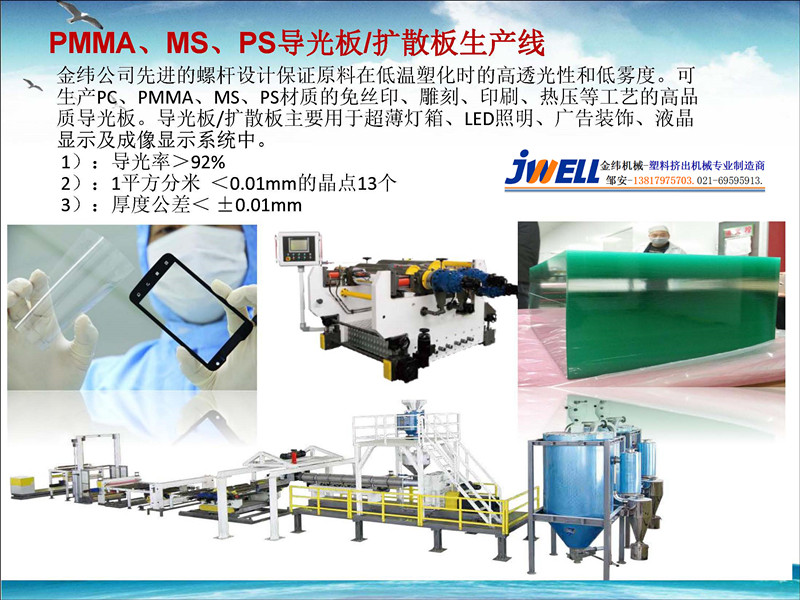 金緯公司先進的螺桿設計保證原料在低溫塑化時的高透光性和低霧度。可生產PC、PMMA、MS、PS材質的免絲印、雕刻、印刷、熱壓等工藝的高品質導光板。 導光板/擴散板主要用于超薄燈箱、LED照明、廣告裝...