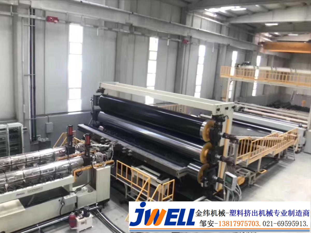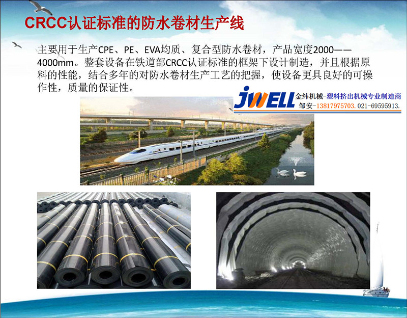 金緯機械專業生產CRCC認證標準的防水卷材生產線,設備具有產量高、生產穩定性好,主要用于生產CPE、PE、EVA均質、復合型防水卷材,產品寬度2000——4000mm。